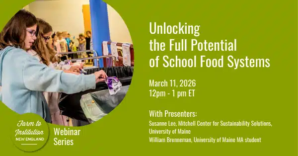 In a largely rural state, Maine schools are a key community food resource providing nutrition to the most vulnerable in our communities – our children. But when Maine school cafeterias generate over 7 million pounds of food waste annually (NRCM 2019) and the largest waste is the nutritious fruits and veggies, we have a problem. Fortunately, some Maine school districts are working to stop the waste and unlock the full potential of school food systems to sustainably and nutritiously feed our children. The University of Maine’s Mitchell Center for Sustainability Solutions has been working with Maine school nutrition directors and their school communities on food waste prevention programs. Join Faculty Fellow Susanne Lee and MA Student William Brenneman to hear about their research and their success, and walk away with ideas on how you can reduce food waste in your school.