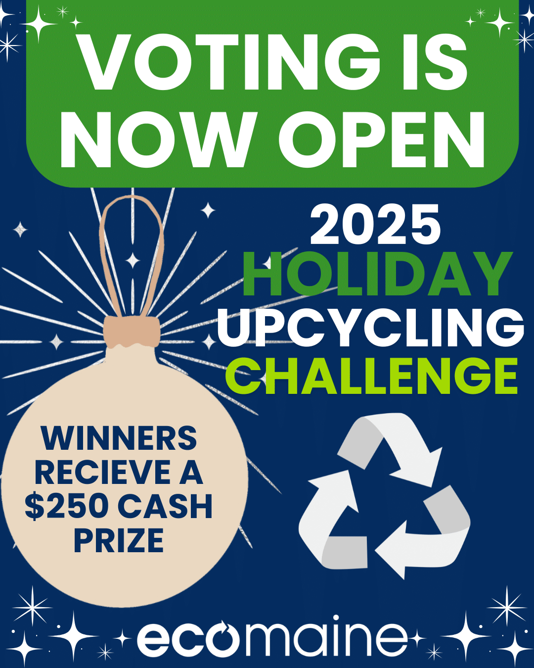 All the upcycled, holiday-themed creations are in, and now it’s your turn to help crown the winners of two $250 cash prizes from ecomaine.